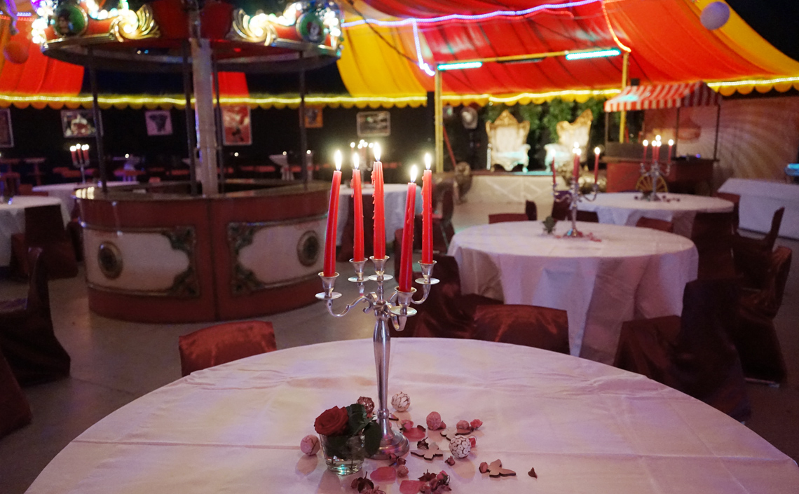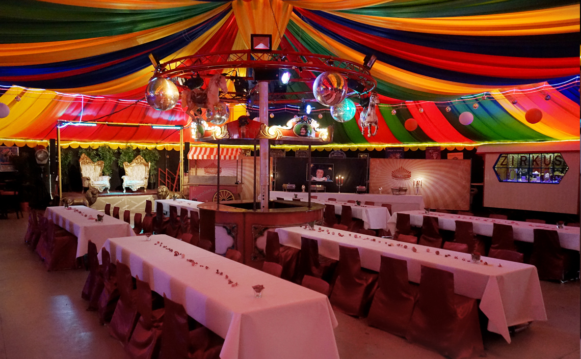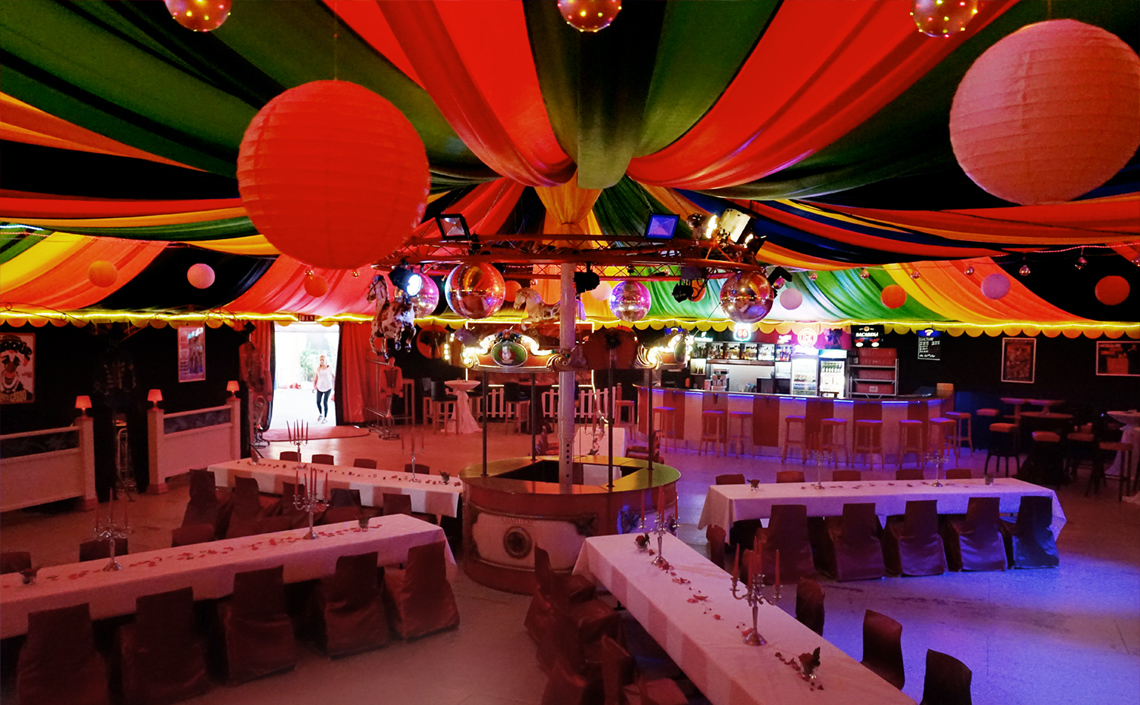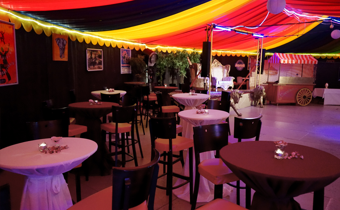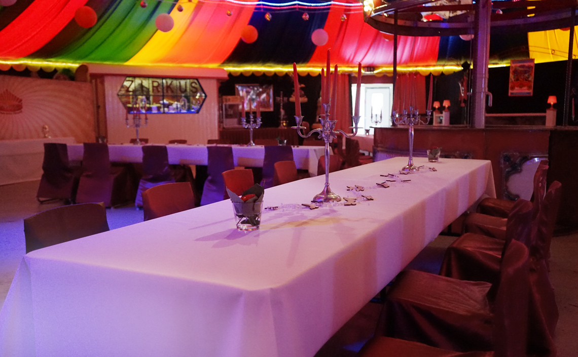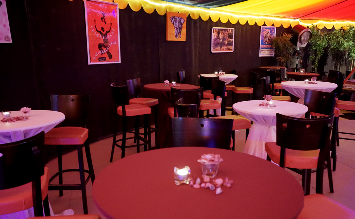 Auf 450qm bietet unser runder Einmaster rundum Platz für ein tolles Event. Das Zelt lässt sich flexibel mit Sitz- und Stehtisch-Plätzen oder einer Bankett-Bestuhlung einrichten. Theke, Bühne, Lichtanlage und eine Musikanlage stehen bereit. Im Aussenbereich ist zusätzlicher Platz für OpenAir-Veranstaltungen mit Grillmöglichkeit. Jede Veranstaltung ist individuell. Wir stehen mit Rat und Tat zur Seite und sorgen mit Ihnen für optimale Vorbereitung und einen unvergesslichen Tag.
